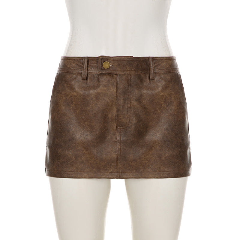 Rock that effortless edge with this low-rise brown faux leather mini skirt. The sleek synthetic leather delivers that coveted luxe look without the price tag, while the flattering low-rise cut keeps things bold and modern. Perfect for pairing with crop tops, oversized tees, or fitted bodysuits—this versatile piece transitions seamlessly from weekend vibes to night-out ready. Comfort meets attitude in one seriously stylish staple.
