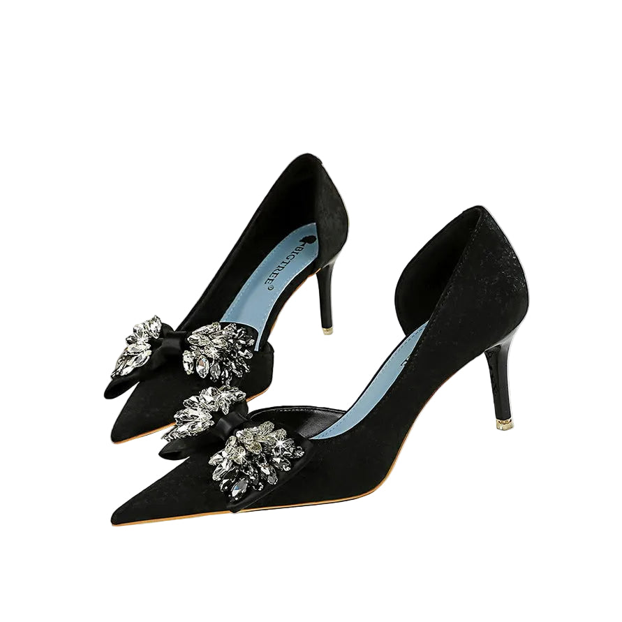 Step into sophistication with these stunning Silver Bow Broach Pumps! Featuring a chic pointy toe and a glamorous 3" heel, these pumps deliver the perfect blend of elegance and edge. The eye-catching silver bow broach detail adds a touch of sparkle and personality to any outfit—whether you're dressing up for a night out or elevating your everyday look. Slip them on and let your feet do the talking!