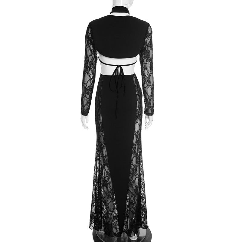 Turn heads in this stunning Cut Out Patchwork Lace Maxi Dress, designed for those who dare to make a statement. Featuring strategic side cutouts and playful peek-a-boo details, this dress balances sophistication with bold allure. The flattering halter neckline and open back create an elegant silhouette, while the patchwork combination of sheer lace and black fabric adds visual intrigue and dimension. Perfect for evening events, date nights, or any occasion where you want to showcase your confident style. This dress transforms ordinary moments into unforgettable ones.